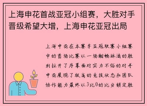 上海申花的这场亚冠小组赛首战胜利,不仅仅是一场普通的胜利,更是球队迈向更高目标的重要一步。申花的表现证明了他们完全有能力在亚冠赛场上与强敌掰手腕,也让球迷们对球队的未来充满信心和期待。希望申花能够在接下来的比赛中继续保持这样的状态,争取在亚冠赛场上取得更好的成绩!