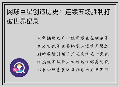 近日,一位网球巨星创造了历史,打破了世界纪录,以连续五场胜利的成绩引起了广泛关注。这一突破性成就不仅让人们对这位球员的技术和心理素质刮目相看,也为世界网球赛事增添了浓墨重彩的一笔。本文将从四个方面详细探讨这次胜利的重大意义:首先,分析这一历史性成就的背后因素,包括球员的技术特点与心理状态;其次,回顾这五场胜利的精彩过程,突出比赛中的关键时刻;接着,探讨该成就对世界网球界产生的深远影响,特别是对年轻一代球员的激励作用;最后,展望该纪录能否被其他球员打破,以及这项纪录对网球运动未来发展的启示。通过对这些方面的细致分析,我们可以全面理解这一历史性事件的深远意义。