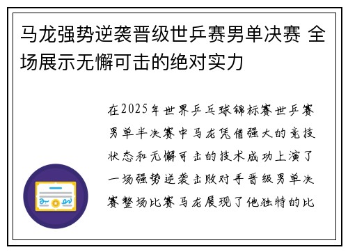 在2025年世界乒乓球锦标赛(世乒赛)男单半决赛中,马龙凭借强大的竞技状态和无懈可击的技术,成功上演了一场强势逆袭,击败对手晋级男单决赛。整场比赛,马龙展现了他独特的比赛风格、战术灵活性和极高的心理素质,证明了自己依然是世界乒坛的顶尖选手。本文将从四个方面详细分析马龙在此次比赛中的表现,包括技术方面的绝对优势、战术布局的巧妙应用、心理素质的稳定表现以及关键时刻的逆袭能力。通过这些角度,我们可以更全面地理解马龙为何能在世界级的竞技舞台上脱颖而出,持续保持着世界冠军的水平。