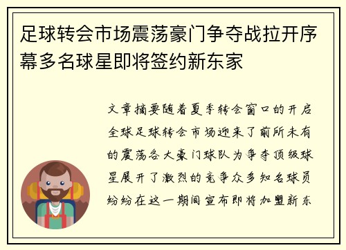 随着夏季转会窗口的开启,全球足球转会市场迎来了前所未有的震荡。各大豪门球队为争夺顶级球星展开了激烈的竞争,众多知名球员纷纷在这一期间宣布即将加盟新东家,成为各大俱乐部的重点引援对象。由于大规模的资金投入和引援需求,转会市场的格局也在不断发生变化。与此同时,豪门之间的争夺战愈演愈烈,球员的转会动向牵动着全球球迷的心。本文将从四个方面进行详细探讨:豪门球队的引援策略,顶级球员的转会趋势,转会市场的影响因素,以及如何影响未来赛季的竞争格局。通过这些分析,读者将能够全面了解这一转会市场的震荡及其对足球行业的深远影响。