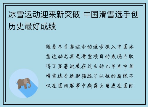 中国滑雪选手在国际赛事中的创新突破,是他们历史最好成绩的重要体现。近年来,中国滑雪队在多个世界级赛事中创造了历史性佳绩,尤其是在冬季奥运会、世界杯等重要比赛中,取得了令人瞩目的成绩。通过这些赛事,选手们的竞技水平和自信心得到了显著提升。