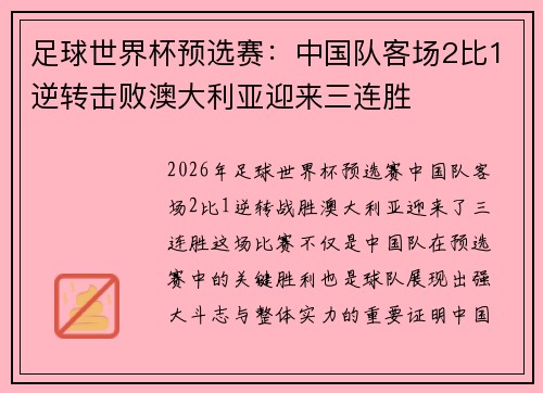2026年足球世界杯预选赛,中国队客场2比1逆转战胜澳大利亚,迎来了三连胜。这场比赛不仅是中国队在预选赛中的关键胜利,也是球队展现出强大斗志与整体实力的重要证明。中国队在客场面对强敌澳大利亚时,先失一球,但凭借顽强的意志力和战术执行,成功逆转并最终收获三分,继续在世界杯预选赛中保持着不败纪录。本文将从四个方面详细分析这场比赛的意义与亮点,包括比赛过程分析、中国队的战术布置、球员个人表现以及这场胜利对中国队未来晋级形势的影响,最后进行总结,展望中国队的世界杯预选赛前景。