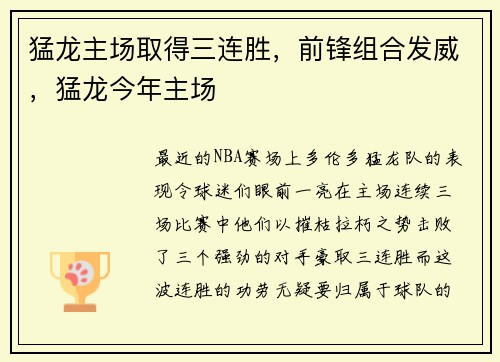 猛龙的这波三连胜,不仅仅是一次短暂的爆发,更是球队整体实力的体现。从锋线双星的出色表现,到全队的默契配合,猛龙展现出了强大的竞争力。球迷们有理由相信,这仅仅是猛龙重回巅峰的开始。未来,随着球队继续磨合和调整,猛龙必将展现出更强的战斗力,向更高的目标发起冲击。