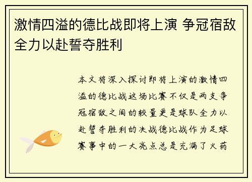 本文将深入探讨即将上演的激情四溢的德比战,这场比赛不仅是两支争冠宿敌之间的较量,更是球队全力以赴、誓夺胜利的决战。德比战作为足球赛事中的一大亮点,总是充满了火药味和对抗性。在这场赛事中,不仅涉及两队间的技战术较量,还有球员个人的状态与心态、球迷的热情与支持、以及背后的历史恩怨与文化传承等多重因素。本文将从四个方面对这场即将上演的德比战进行详细分析:球队的阵容与备战、球员状态与心态、比赛的战术博弈,以及球迷和社会影响。通过这四个角度,力求展现出这场德比战的独特魅力和重要性。