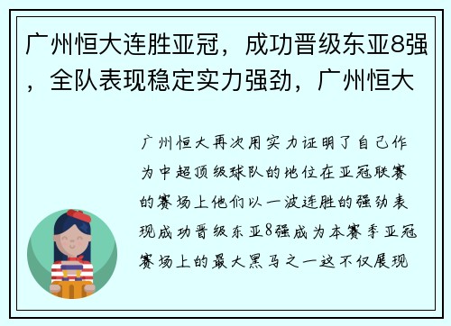 广州恒大再次用实力证明了自己作为中超顶级球队的地位。在亚冠联赛的赛场上,他们以一波连胜的强劲表现,成功晋级东亚8强,成为本赛季亚冠赛场上的最大黑马之一。这不仅展现了球队的战术素养和团队协作能力,也为中国足球在国际舞台上的表现增添了一抹亮色。